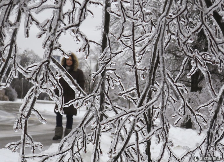 多倫多市中,可以看到一名女性走過受到冰風暴席捲的樹林間