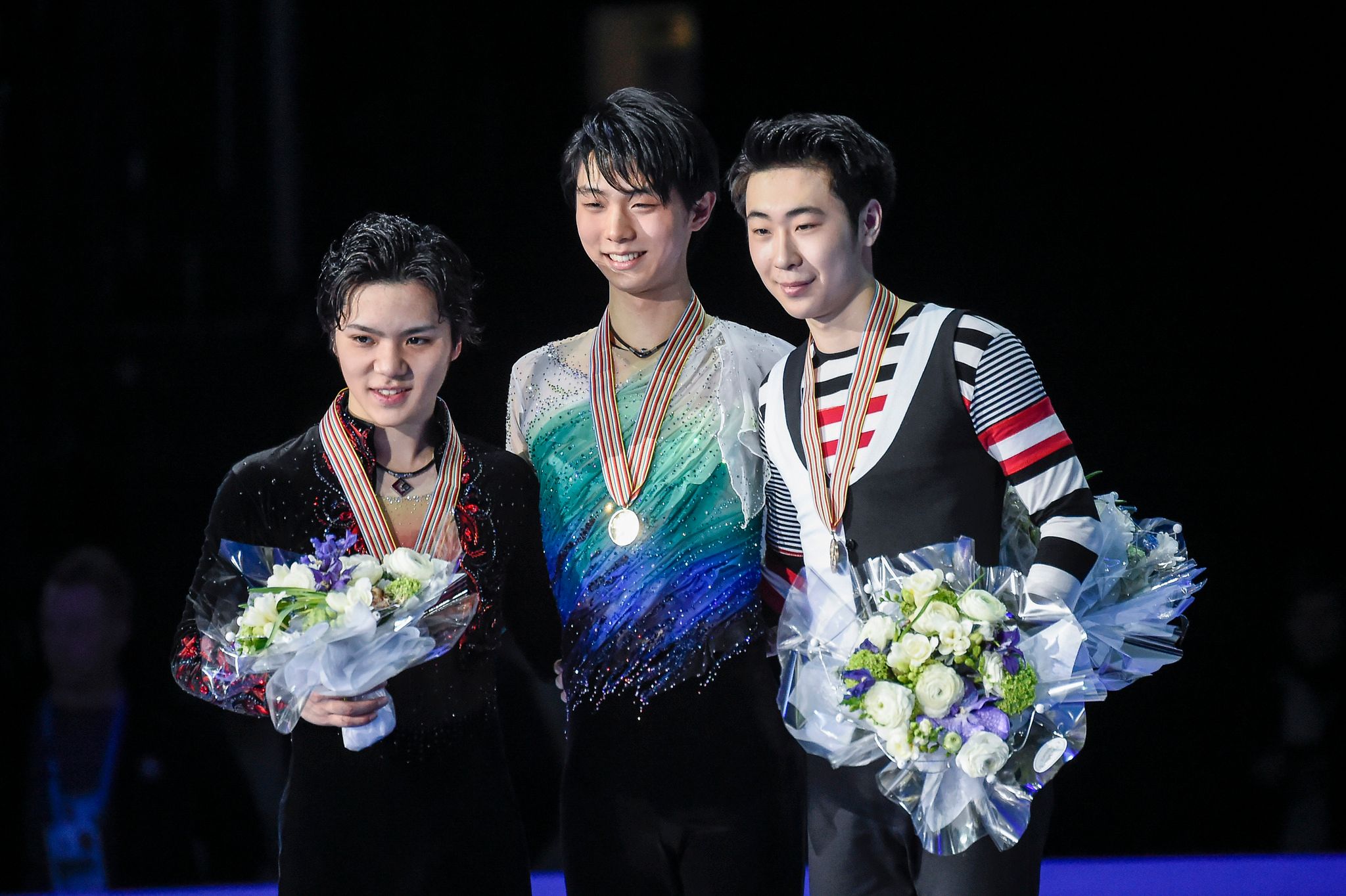 圖為2017年世界花式滑冰錦標賽男子組頒獎儀式的照片,由左至右為日本的宇野昌磨、羽生結弦、中國的金博洋。