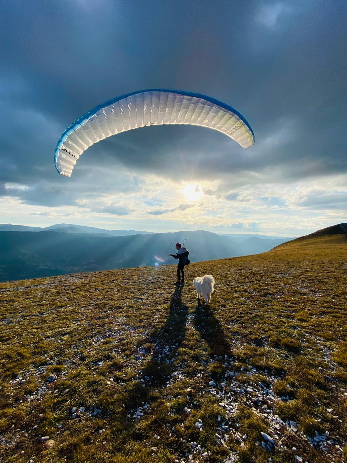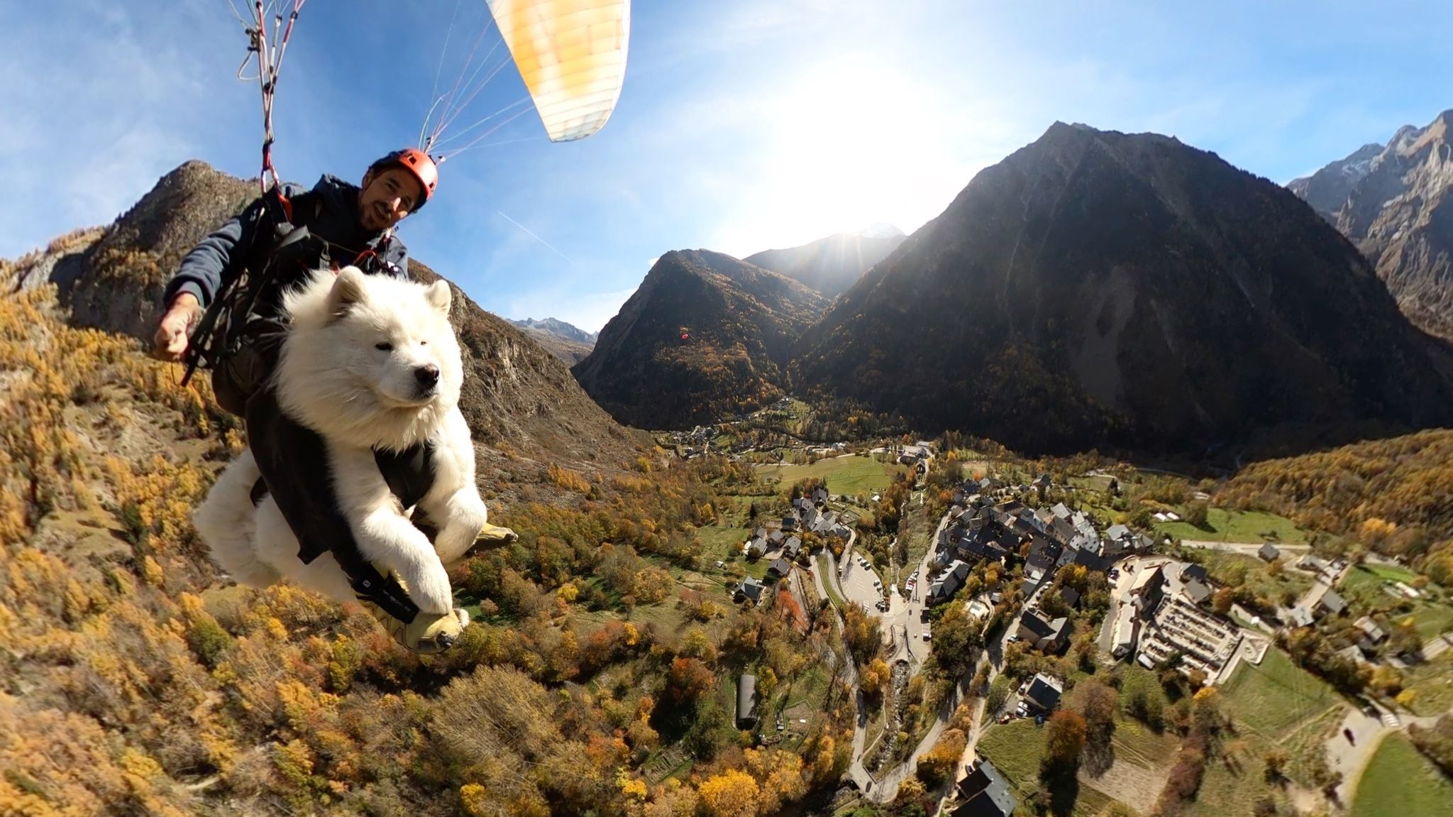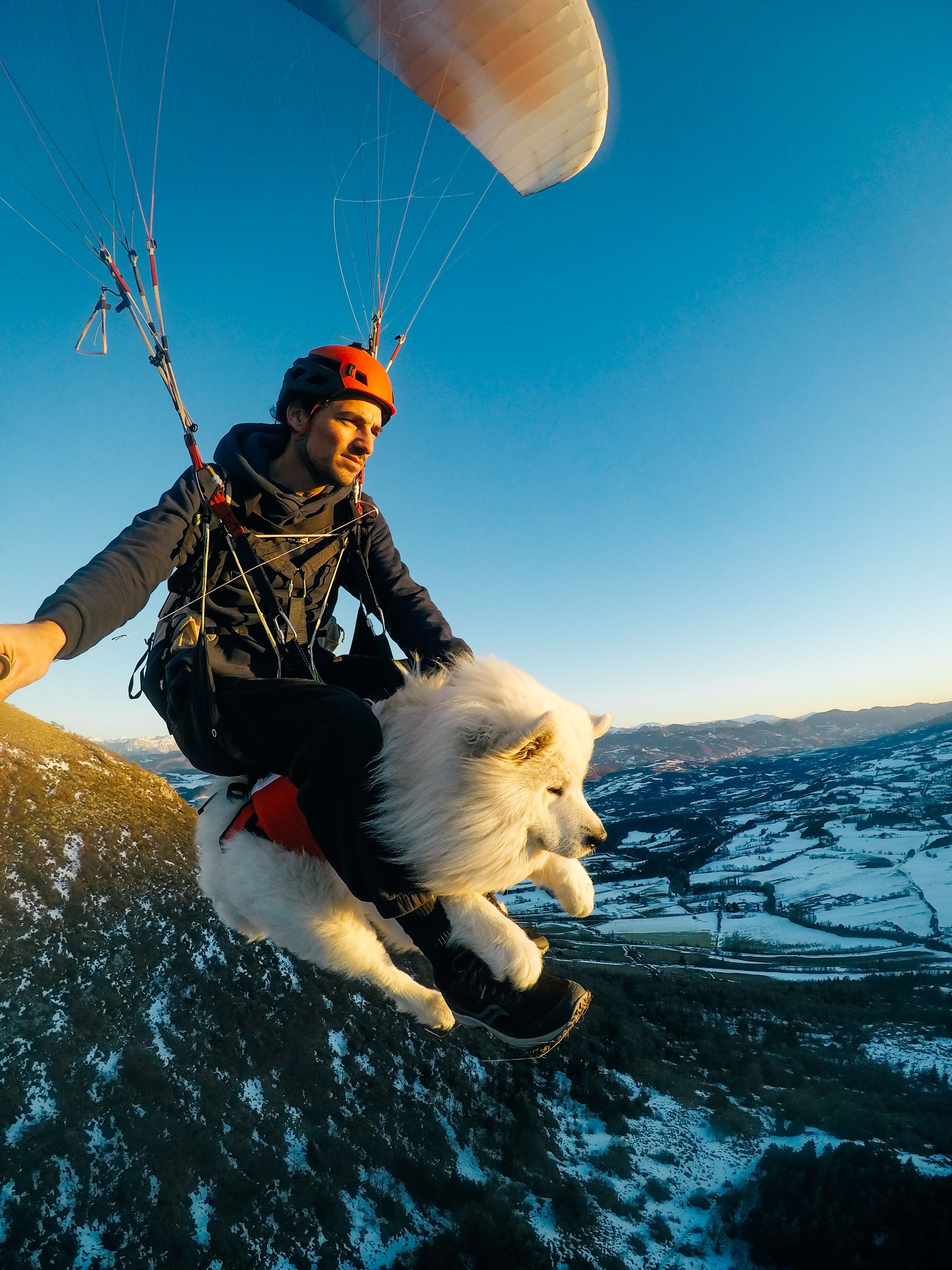 確認好所有裝備的安全性後,沙姆斯挑了一個天時地利人和的日子,跟烏卡說了聲「我們準備起飛囉」,一人一狗隨即在草地上飛快的跑…跑…跑…飛起來了!