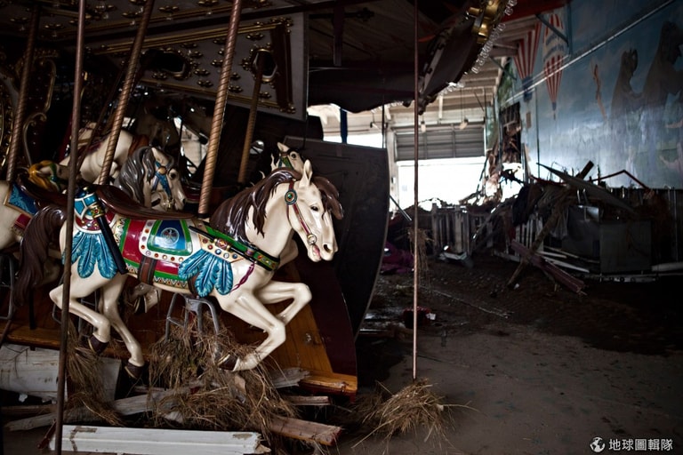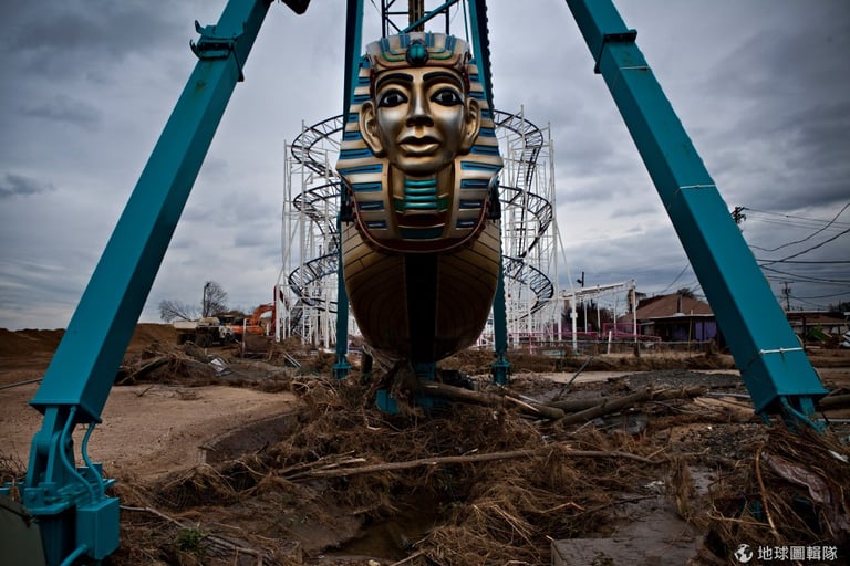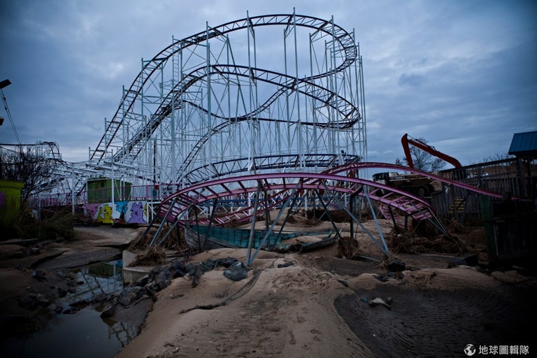 「金斯堡遊樂園」(Keansburg Amusement Park)這次不管是園內園外都遭受颶風強力的衝擊。圖片來源: Andrew Burton/Getty Images