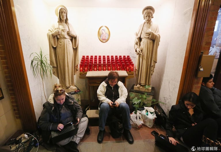 紐澤西的居民正在教堂內休息,順邊幫手機充電。圖片來源:Mario Tama/Getty Images