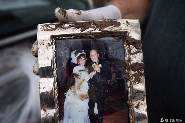 一對夫妻的結婚照,在泥濘中被挖出。圖片來源:John Moore/Getty Images