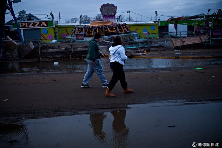紐澤西州的居民走在平常喜歡的遊樂園中,不敢置信地看著這一切。圖片來源:'Andrew Burton/Getty Images