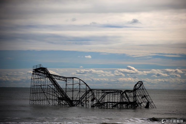 紐澤西的海岸遊樂園受損嚴重,雲霄飛車只能孤零零地的淹沒在大海中。圖片來源:Mark Wilson/Getty Images