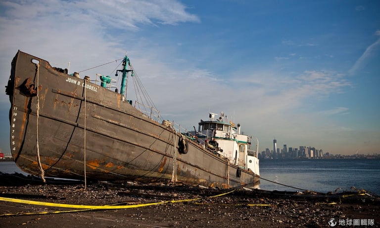 紐約州附近的海岸,一艘巨大的艦艇被沖上岸。圖片來源:Andrew Burton/Getty Images