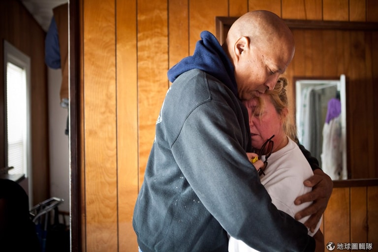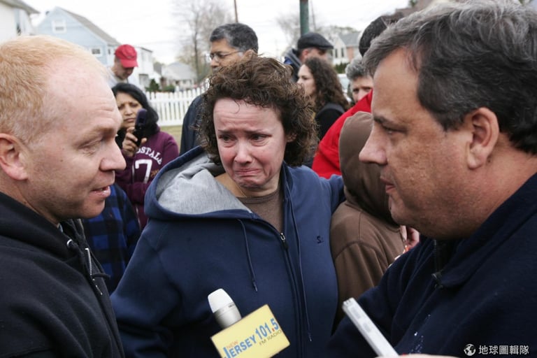 紐澤西州州長克里斯蒂(Chris Christie)探訪居民的情況,深受民眾歡迎的他,被老奶奶抱著不放。圖片來源:Kevin R. Wexler-Pool/Getty Images