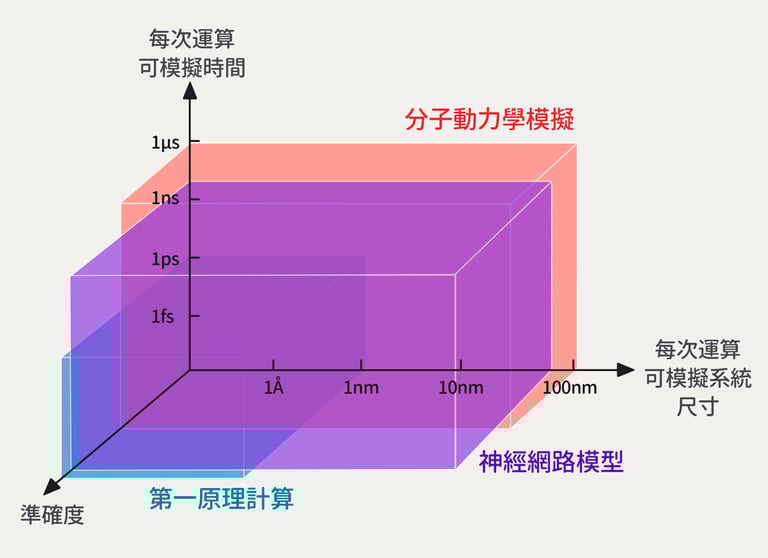 分子動力學模擬大約可以模擬 100 奈米內的三維材料,抓到數個微秒(10-6 秒)內的原子狀態,可模擬的系統尺寸和時間都比第一原理計算要來得多!可惜準確度對於現在化學組成高度複雜的新穎材料而言是一個極大的挑戰。