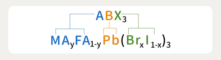 在眾多複雜鈣鈦礦材料中,包淳偉研究員探討的是 MAyFA1−yPb(BrxI1−x)3 ,下標符號 y 和 1-y 表示相對含量,如果 MA 佔 60%、FA 就是 40%,因為 MA 和 FA 會競爭同一個位置;同理 Br 和 I 亦然。