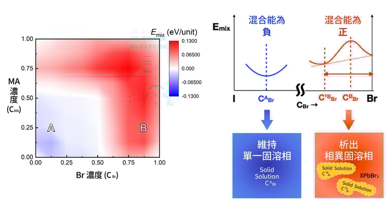 從 MAyFA1−yPb(BrxI1−x)3 混合能分布初步來看,Br 濃度(CBr)或 MA 濃度(CMA)越高的時候,混合能就越高,系統越容易析出相異的固溶相。