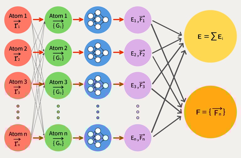 這套神經網路模型如何運作?先輸入原子座標(位置向量 r),再換算成「原子指紋」(特徵向量 G,表示該原子與其他原子之間獨一無二的相對關係),之後透過神經網路,快速輸出整個材料系統的原子能量和作用力。