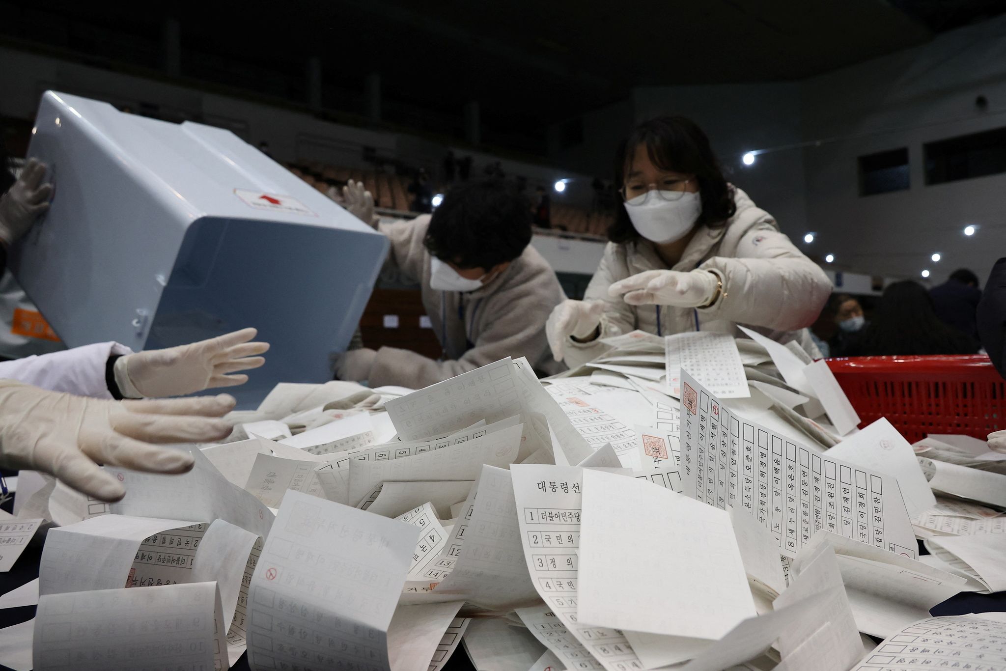 3月9日南韓大選的當日,中央選舉管理委員會(National Election Commission)的選務人員正在整理著選票。