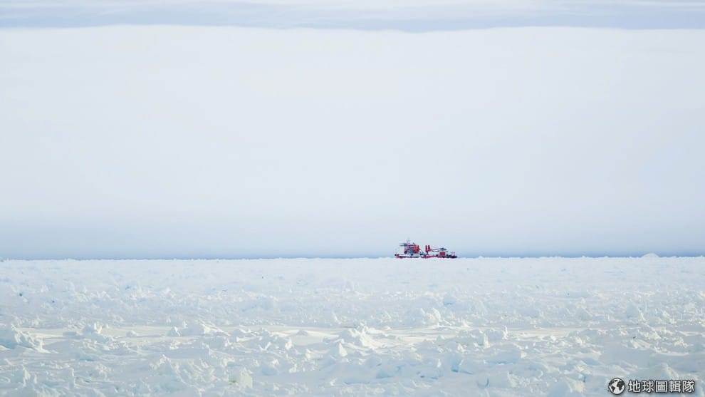 照片中遠方的船隻是中國的科學考察船「雪龍號」,這艘破冰船原本要前往救助卡在半路的俄國客船紹卡利斯基(MV Akademik Shokalskiy),但因為厚重的冰雪也無法動彈,卡在目標6海里外,雪龍號是3艘前往搜救俄船的破冰船之一,其他還有澳洲的南極光號(Aurora Australis)。