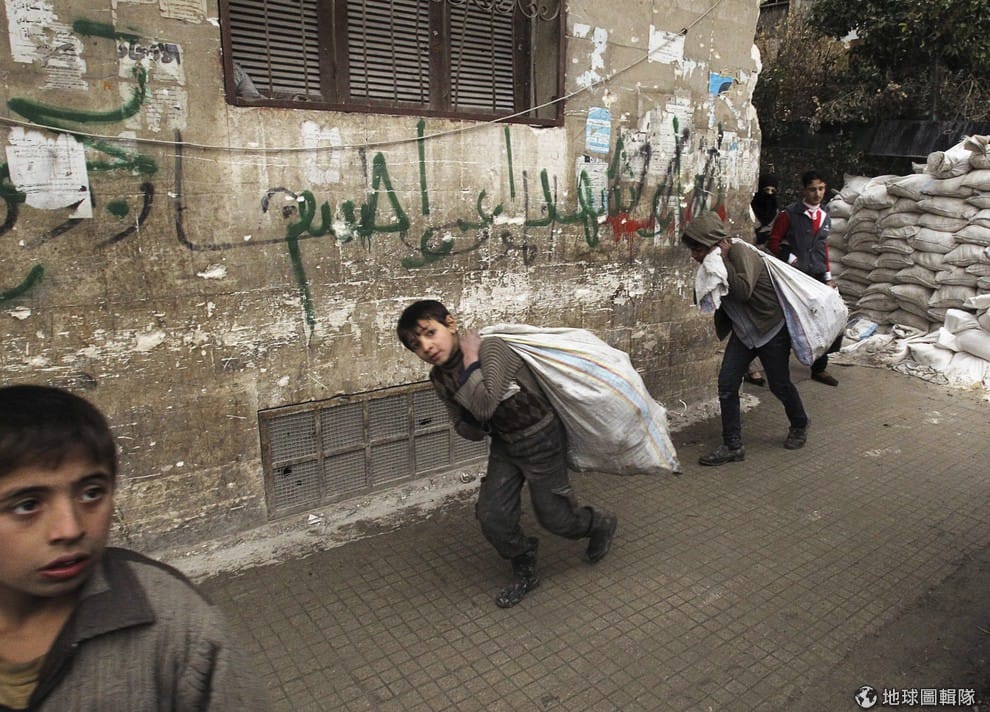 孩子們搬著貨物走過「卡拉傑路口」(Karaj al-Hajez crossing),這邊將敘利亞大城阿勒坡一分為二,一邊是反政府軍把持,另一邊則是政府軍掌控。