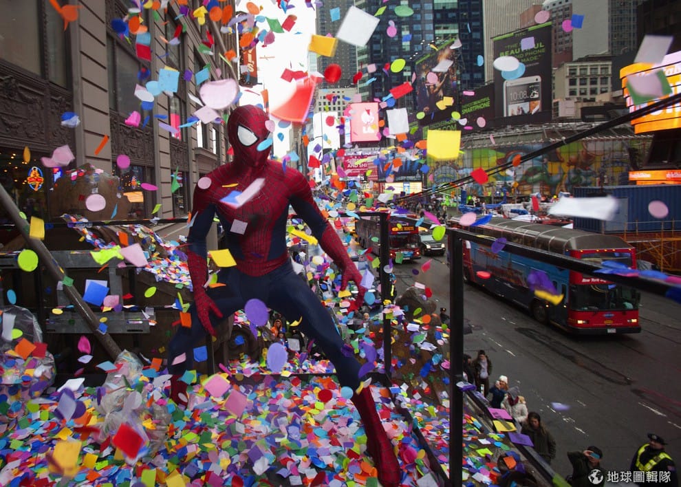 紐約時代廣場上,紐約時代廣場上,一位民眾換上蜘蛛人的裝扮接受拍照。時代廣場上正在位即將開始的跨年活動進行預演測試