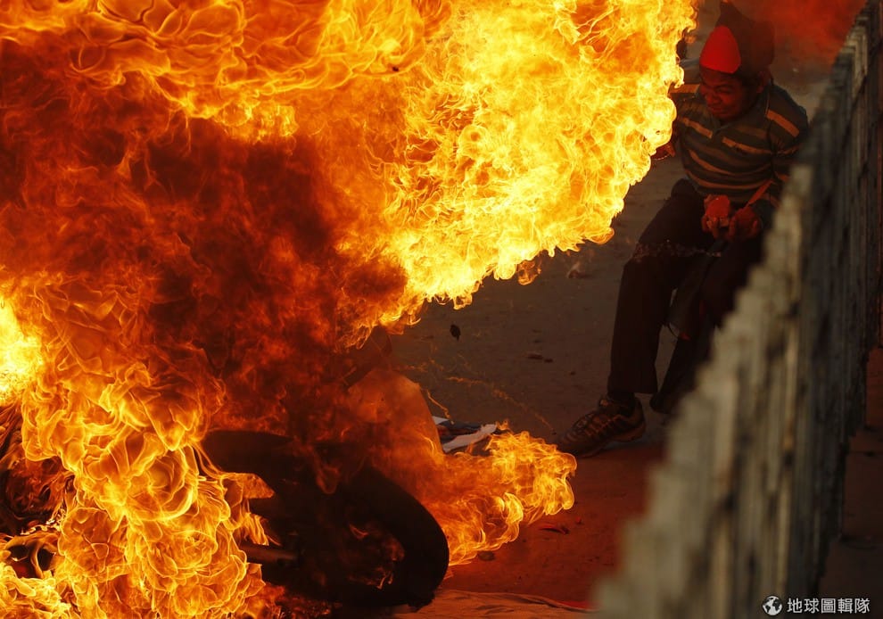 支持政府的活動份子與支持孟加拉國家黨律師們發生衝突中,他們對著一旁的機車放火,周日的衝突中,至少有3名律師受傷。