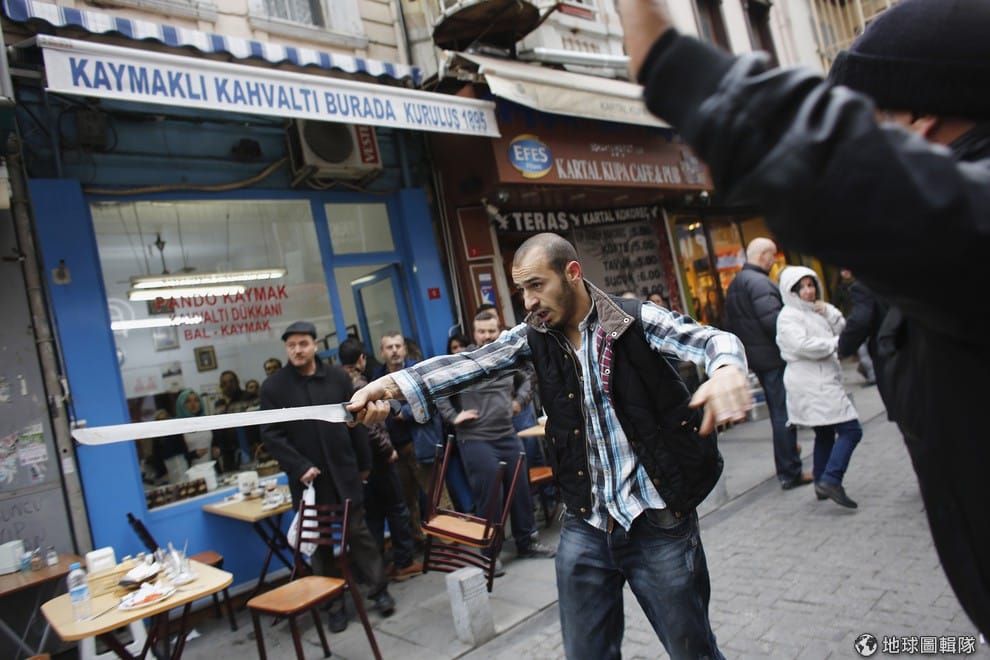 照片中的男子用手中的土耳其烤肉刀指著反政府的示威者們。土耳其境內的支持左派自由與獨立黨(ODP)的民眾,他們在29號時上街頭抗議政府,但遭到兩名不明人士持刀攻擊,所幸沒有人受傷,兩名攻擊犯也遭到警方逮捕。土耳其現任總理埃爾多安因為近期貪腐的醜聞纏身,遭到民眾呼喊下台。