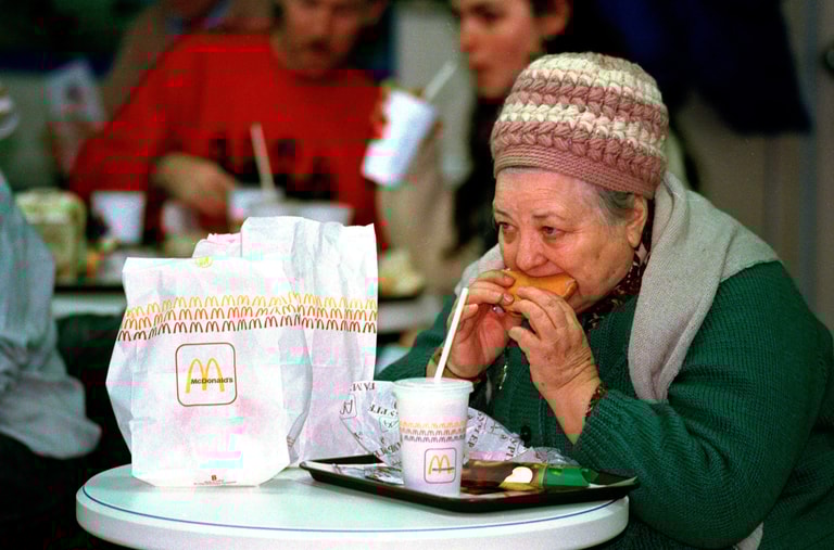 英國《衛報》的記者格羅斯科普(Viv Groskop)回想起她30年前在聖彼得堡(Saint Petersburg)學習俄語時,她陪著第一次到麥當勞的友人們在有著金色拱門招牌的店外排隊。對她的俄羅斯友人而言,這是在共產主義和冷戰之後,俄羅斯人所夢寐以求的「世界的味道」。