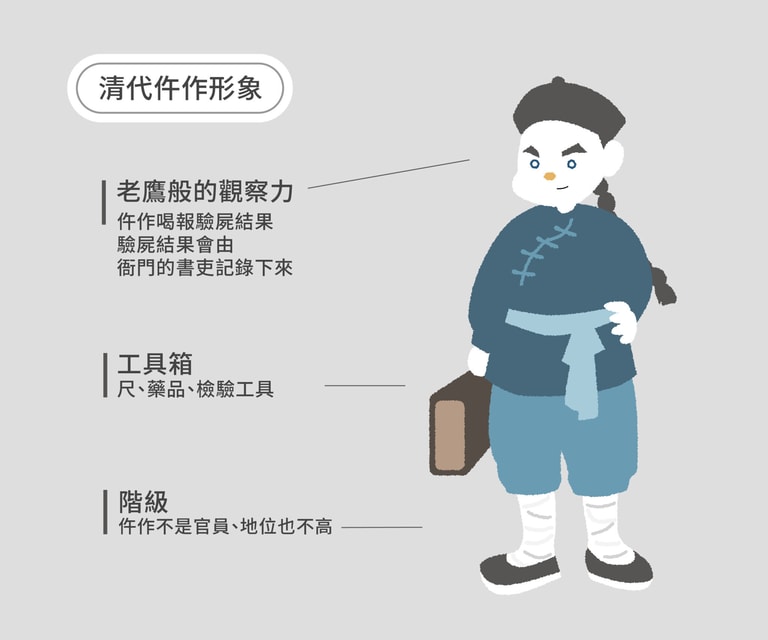 驗屍過程中靈魂人物之一則是仵作。與現今社會地位較高的法醫相比,清代仵作的身份其實是賤民,其子孫都不能參加科考。