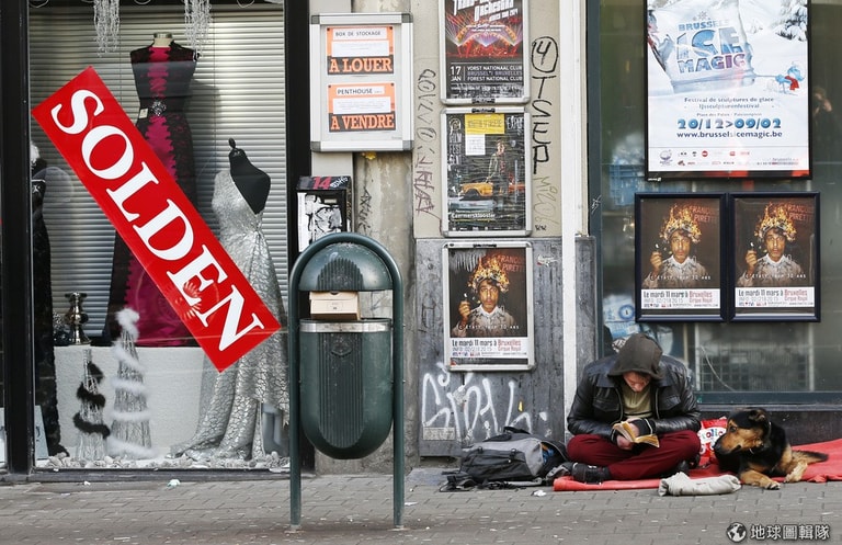 男子和他的狗坐在街頭乞討,一旁的櫥窗寫著冬季特賣會首日開跑