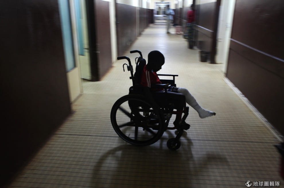 一名男孩坐在輪椅上,他因為手榴彈的波及受傷。中非當地的動亂持續,已經造成該國1/5、上百萬的民眾遠離家鄉,動盪的情勢也阻礙了國際救援行動