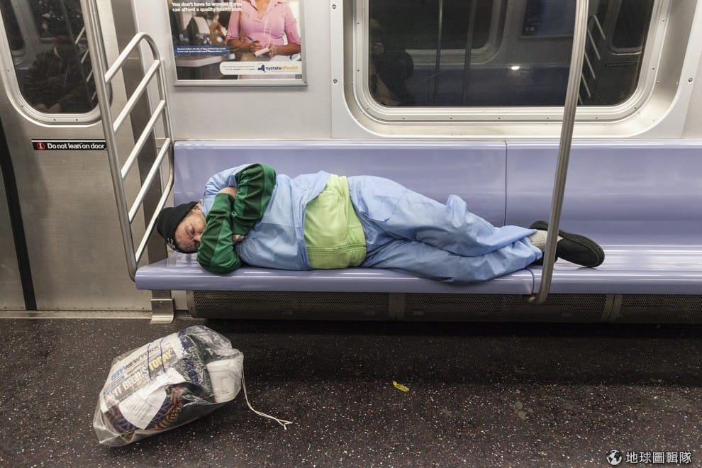 一名男性睡在地鐵車廂中,美國東北地區受到風雪影響,週五時傳出上千架次航班被迫取消預定行程