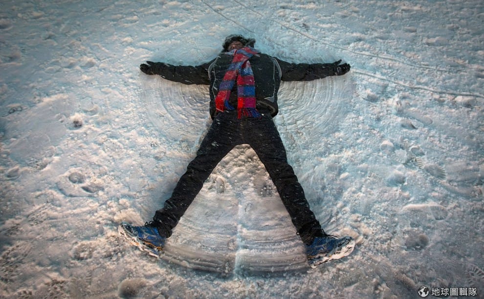 紐約的時代廣場上,一名男性在地上舞動四肢做出「雪天使」。美國東北區受到強烈風雪侵襲,紐約州和紐澤西州都發出的緊急情況,並呼籲民眾進可能待在家中不要外出。