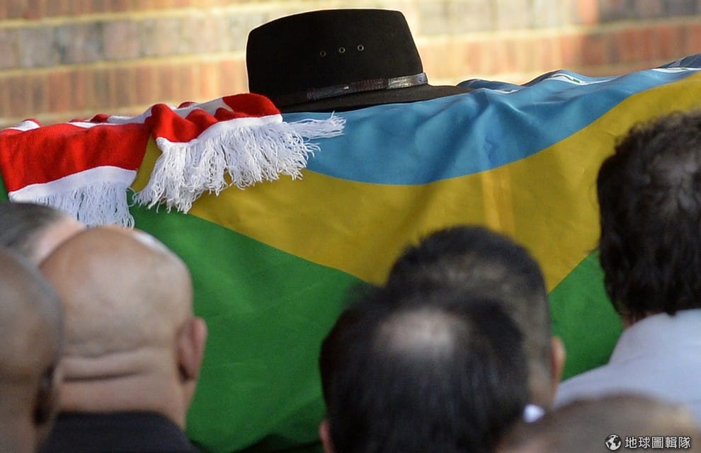 照片中是朗尼畢格斯(Ronnie Biggs)的棺木,即將在戈德斯格林墓園(Golders Green Crematorium)中下葬。