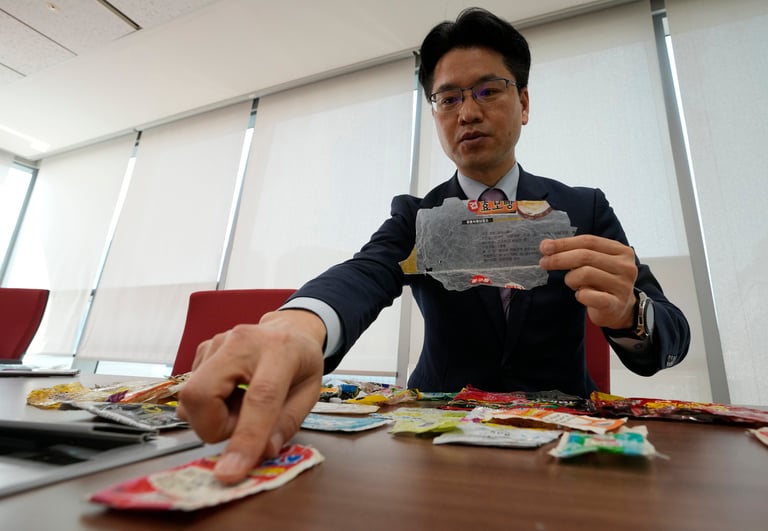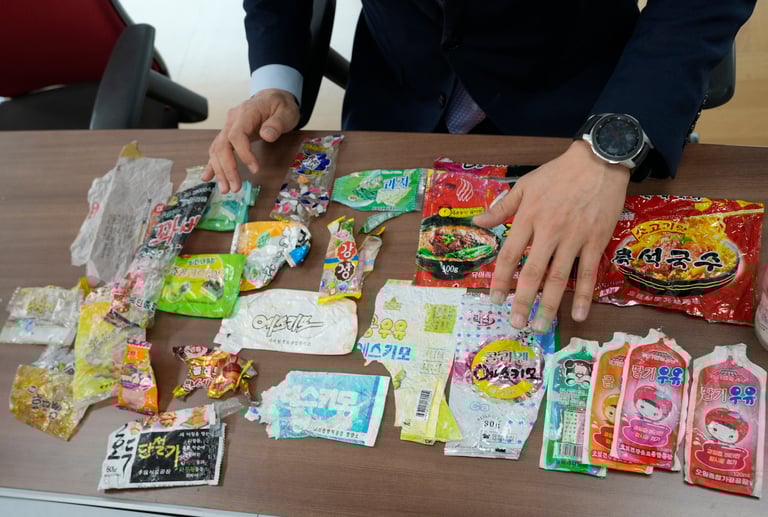 自2020年9月以來,姜東完已經走訪了南韓西部海岸的五個邊境島嶼,並收集了大約2,000件北韓垃圾,其中包括零食袋、果汁袋、糖果包裝紙和飲料瓶等。他驚訝地發現了幾十種不同的彩色包裝,每一種都為不同產品設計,舉凡調味料、冰棒、牛奶優格等的包裝都帶有各種圖形元素、卡通人物和搭配的文宣字體。