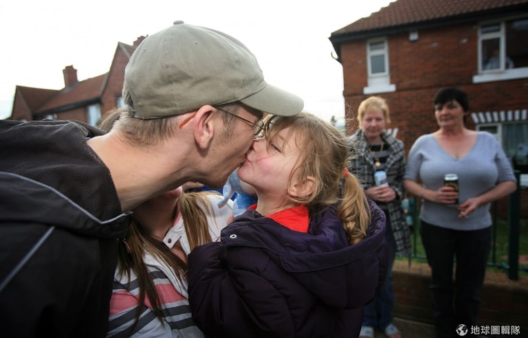 終於可以回家的爸爸,與家人相聚,也終於可以親手抱抱女兒!圖片來源:Abid Katib/Getty Images