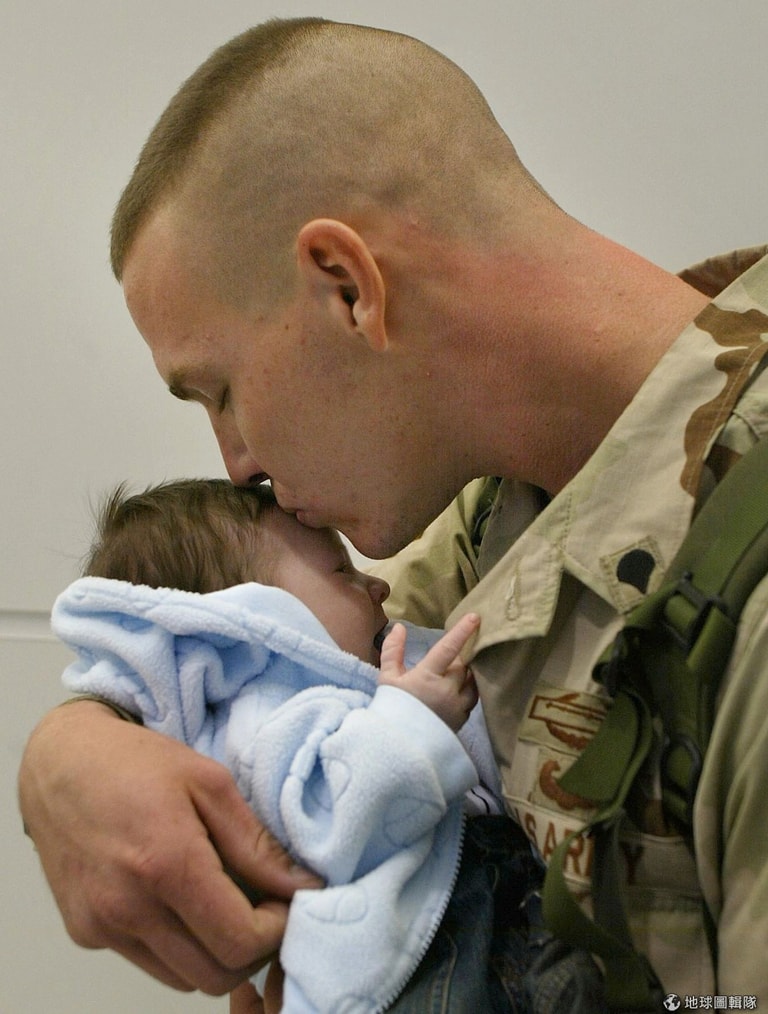 輪調回家將的美國軍官,跟他13個月大的小寶貝相聚,忍不住多親幾下!圖片來源:Sandy Huffaker/Getty Images