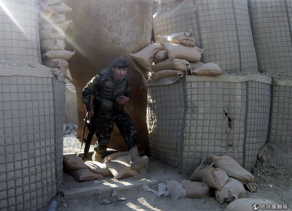阿富汗國家軍隊(ANA)的軍人站在受到暴動份子攻擊的基地附近,這座基地是由北約組織和阿富汗聯手合作所建