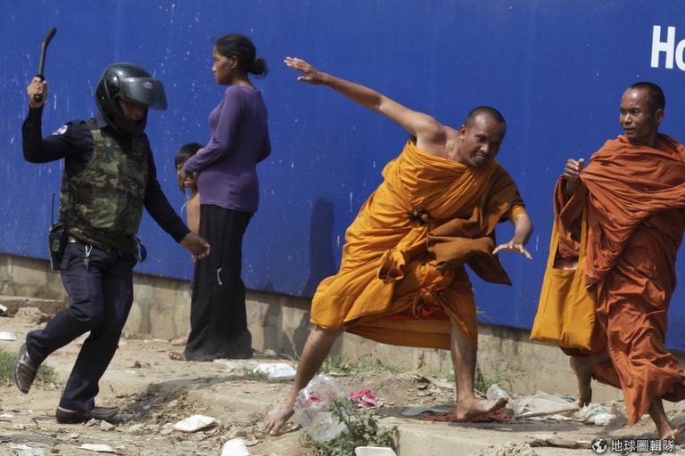 維安員警手持棍棒追逐佛教徒。柬埔寨的成衣廠人員要求調薪,最後引發城警民死傷衝突的事件未歇,上周六(4)時,當地也出現反政府的示威活動,之後示威的營地遭柬埔寨警方拆除,抗議民眾也受到員警戒護。