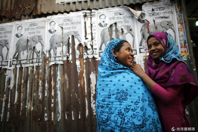 女孩們站在競選海報前。印度的達卡(Dhaka)地區在周日舉行競選前,有將近60處的投票所發生縱火事件,其中更造成3人不幸喪生
