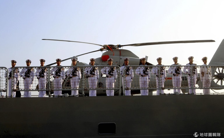 中國海軍站在鹽城號護衛艦(frigate Yancheng)上,鹽城號即將停泊在賽普勒斯的利馬索爾港,這艘船艦將會協助運送敘利亞化武進一步銷毀的任務。