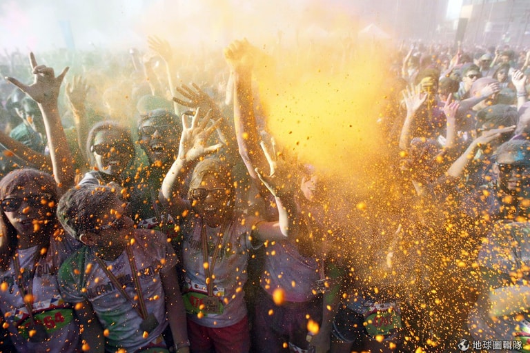 參加"The Colour Run"的跑者們興奮撒出彩色粉末