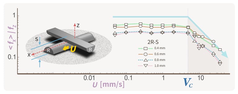 為了解決這些疑惑,團隊進行了許多獨立實驗。其中一個關鍵的實驗,就是量測顆粒軟球材質的「摩擦力」。他們採用同樣是 PDMS 材質的半圓柱棒,兩兩接觸並以不同切面速度(U)拖行,觀察過程中摩擦力的變化。