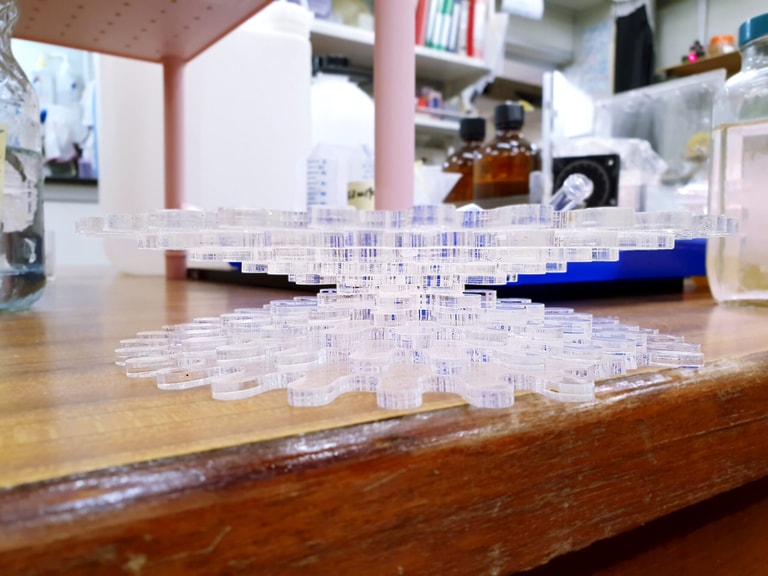 在「顆粒體」方面,蔡日強採用醫用材料(PDMS),製作出許多顆粒軟球,硬度接近橡皮擦、大小約一公分。為什麼會採用「軟」球來代表顆粒體呢?