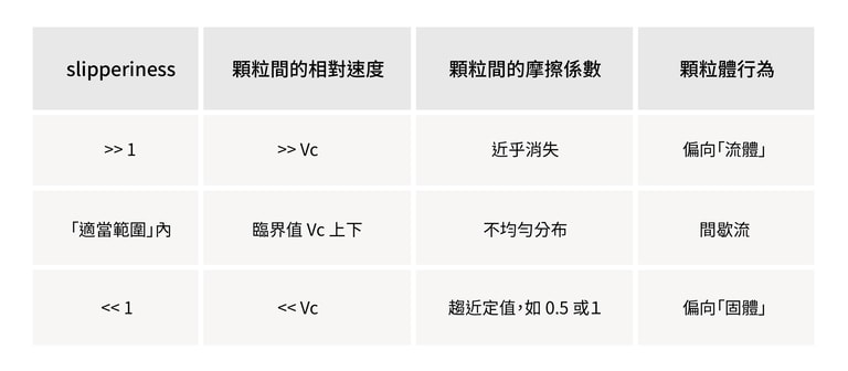 換言之,如果 slipperiness 遠大於 1 ,代表大部分顆粒體之間的速度大於 VC,摩擦係數近乎消失,難以構成橫向的受力,呈現幾乎「自由」的滑動,在這種情況下,顆粒體之間的液體成為阻力的主角,顆粒體的行為會比較偏向「流體」。