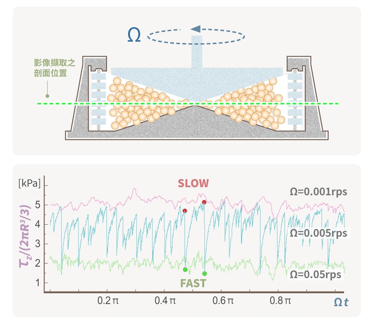 而當我們把這個概念,重新應用在顆粒流實驗時,那些匪夷所思的現象,突然都有了合理的解釋!根據團隊的推測,當錐形圓盤轉速加快,快到一定程度的時候,有些顆粒軟球之間的速度,可能已經超過了 VC,導致顆粒軟球摩擦係數下降,才會讓量到的轉矩降低。而「集體崩落」的發生也可能是如此。