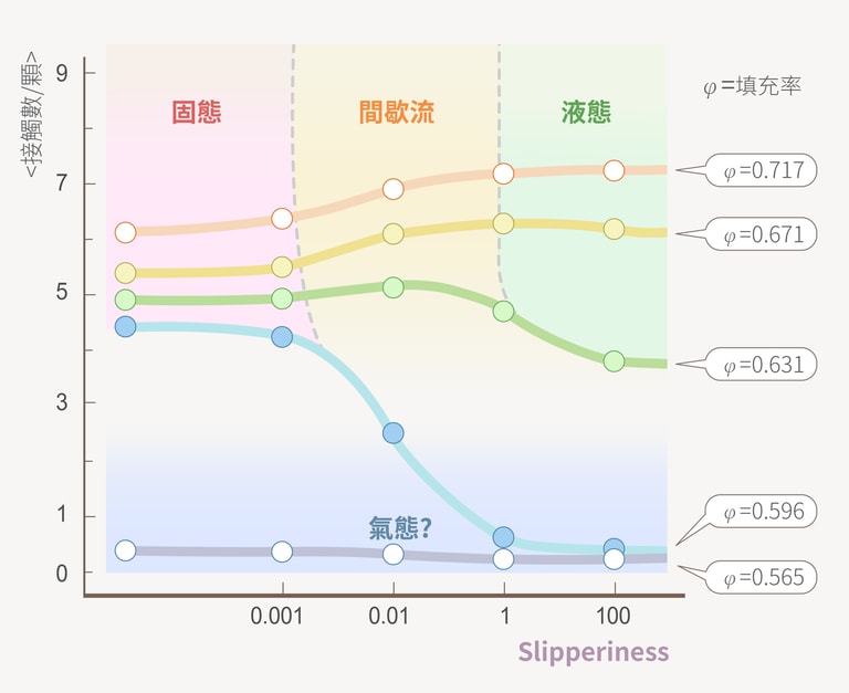 為此,團隊創造了一個無因次量(不帶物理單位的參數),姑且稱為「slipperiness」,希望可以做為顆粒流行為的「預測指標」。