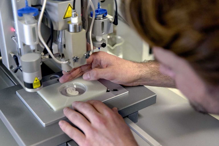在該大樓設施裡,會有專人將軟骨細胞從軟骨的組織分離出來,並將細胞放入調配過的濃縮營養液,增值成數十億的活細胞。3DBio Therapeutics的首席科學家巴哈拉赫(Nathaniel Bachrach)補充:「活細胞接著再和3D列印的生物墨水混和在一起,就像是把巧克力片混入到餅乾麵團冰淇淋(cookie dough ice cream)中。」