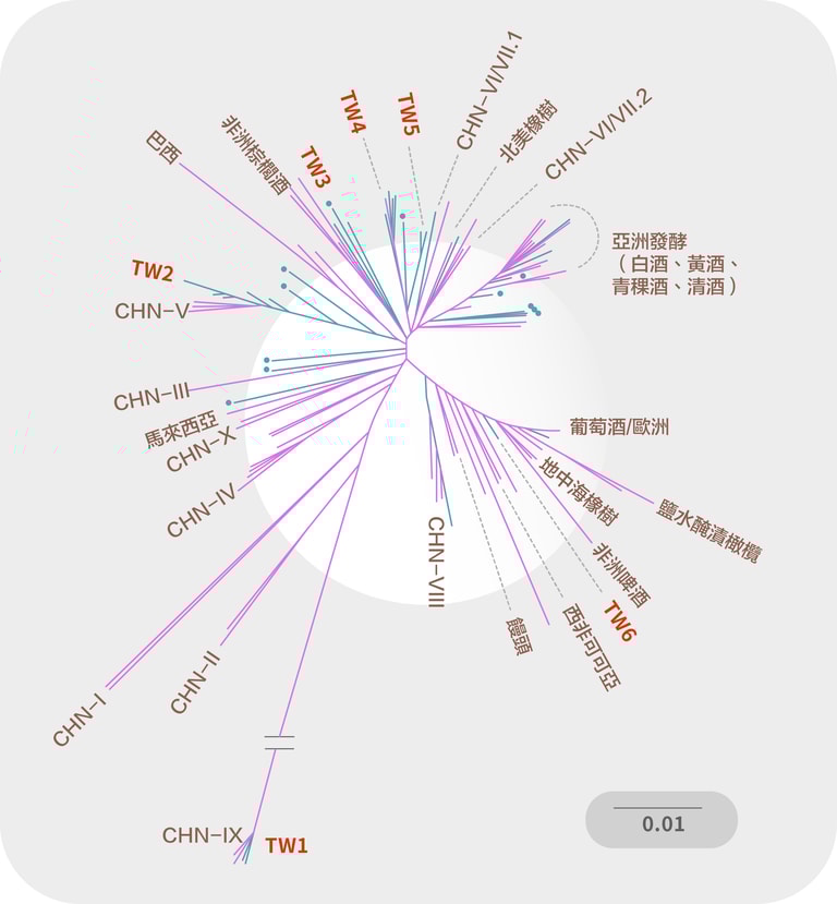 將臺灣的一百多個菌株擺進演化樹,驚奇的事發生了!臺灣存在的釀酒酵母們,竟然也被歸類進各大譜系,並有新的譜系,這表示臺灣的釀酒酵母多樣性,和中國一樣高。而且還有一款進入之前於中國採集到,與同類最早分家的那一群。
