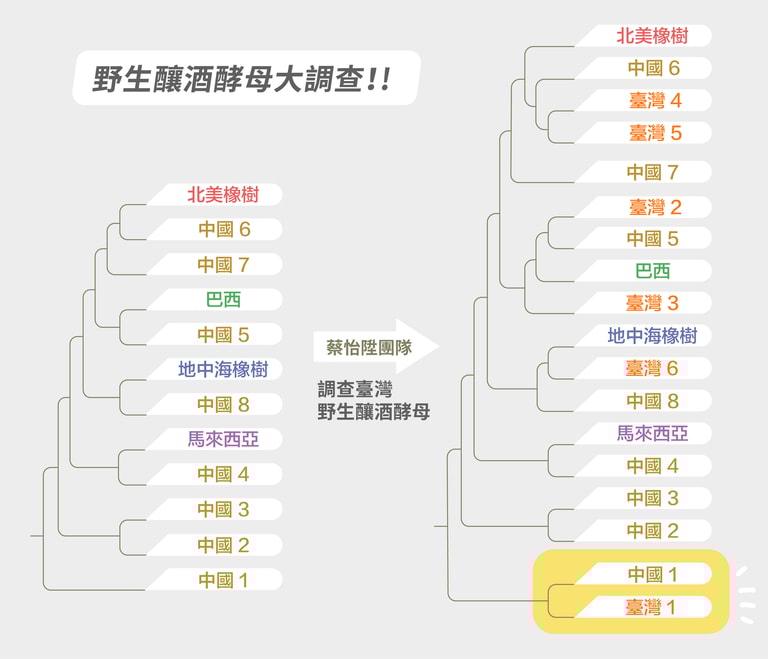 2018 年就有研究者從世界各地收集超過一千個釀酒酵母品系,探討親緣關係。分析發現野生釀酒酵母們彼此的變化差異還不小,東亞的中國為最多變之處;將所有酵母菌擺在一起畫演化樹,中國採集到的品系能歸類到不同譜系(lineages),包括與同類最早分家,差異最大的譜系。