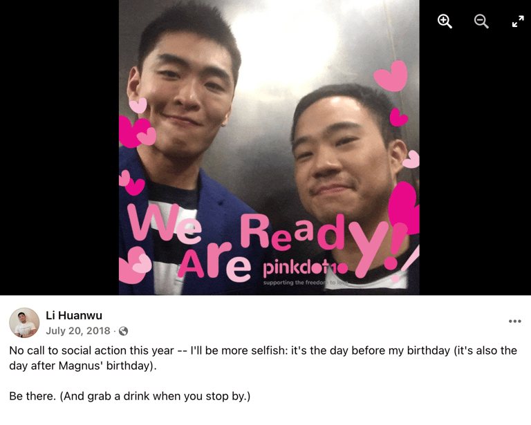 粉紅點活動,後來也吸引李光耀的孫子李桓武(Li Huanwu)挺身支持,讓新加坡當地的LGBTQ支持者備受鼓舞。2018年7月,李桓武公開自己的同志身份,並大方在自己的Facebook頭貼上,加上粉紅點特效框。