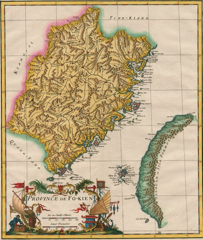 至於這幅〈福建省圖〉也是唐維爾地圖相關延伸版本。它收錄在1738年於英國倫敦出版的杜赫德《中華帝國記述》英譯本裡,是中國各省分圖的第四幅,由英國地圖雕版師鮑恩(Emanuel Bowen)製作。其內容大致與法文版相同,所以也是源自《皇輿全覽圖》的資訊,只是文字全部改成英文,並在左下角條列福建省各主要城市的經緯度數字,而在標題下方,則多註明了「Inscribed to the Reverend Dr. ALLIX, Dean of Ely 」(題獻給伊利座堂主任牧師阿里克斯)等,應是製圖者給予其贊助或支持者的表揚回饋。