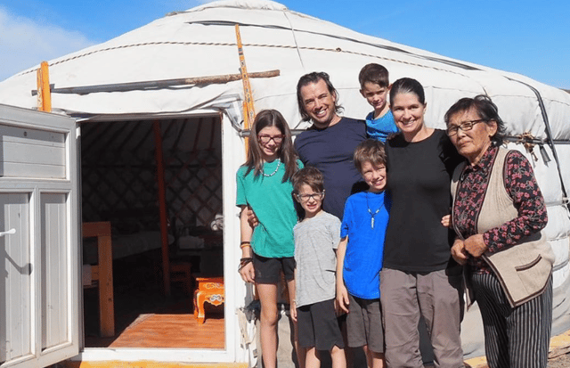 圖為加拿大父母與4個小孩踏上環遊世界的旅行,一家人在蒙古體驗住蒙古包。