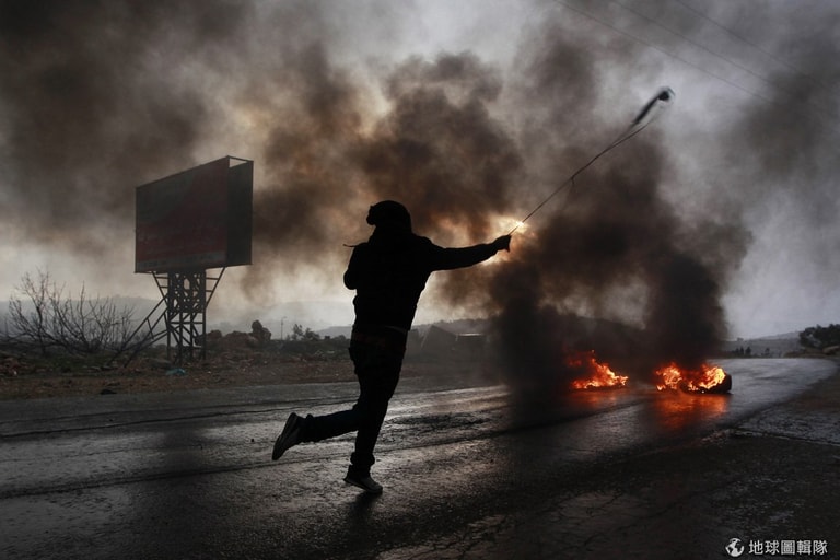 照片中市反對Ofra定居地計畫的巴勒斯坦示威者,他朝以色列軍方丟擲石塊。以色列官方在周五時宣布,他們將在約旦河西岸、以及耶路撒冷東部興建1400戶住屋,這項計畫也是接續在美國國務卿凱利出訪當地之後,凱利希望讓以巴兩國和平談判有所進展,而過去定居地的議題一直是兩國間障礙。