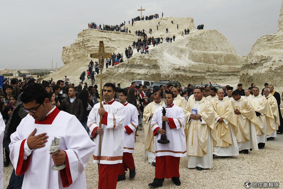 天主教的信眾們正在約旦河畔的受洗地點參加彌撒活動。約有數千名信徒湧到約旦河畔,這也代表他們即將展開朝聖之旅