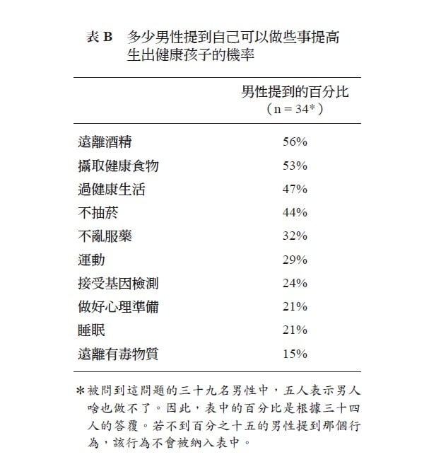長期以來,社會把生殖風險主要放在女性身體上,一般男性也延續這樣的傳統,所以非常熟悉當代公共衛生的訊息,知道母體攸關生殖結果。儘管我提出的問題裡,完全沒有提到女性生殖健康,但是這話題在我訪談紀錄裡,占了很大比重,男性(不管學歷高低)都提到了女性的年齡、健康、暴露物對孩子健康的重要性。實際上,在我拿傳單給他們看之前,我問了個問題,希望確定男性是否知道父體效應這類訊息:「若有對夫婦計畫懷孕生子,你知道男性可以做什麼,提高生出健康孩子的機率?」逾百分之七十受訪者說,男性可做的是確保女性健康。