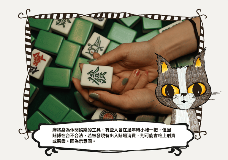 不過,賭博在台灣並不合法,除境外各式大型賭場外,境內只要有兩桌以上明顯可以看出盈利的私人場所或麻將館等,如果被抄都可能會因違反《刑法》賭博罪第268條,面臨遭處三年以下有期徒刑,得併科九萬元以下罰金的後果;賭客也會被處以五萬元以下罰金。